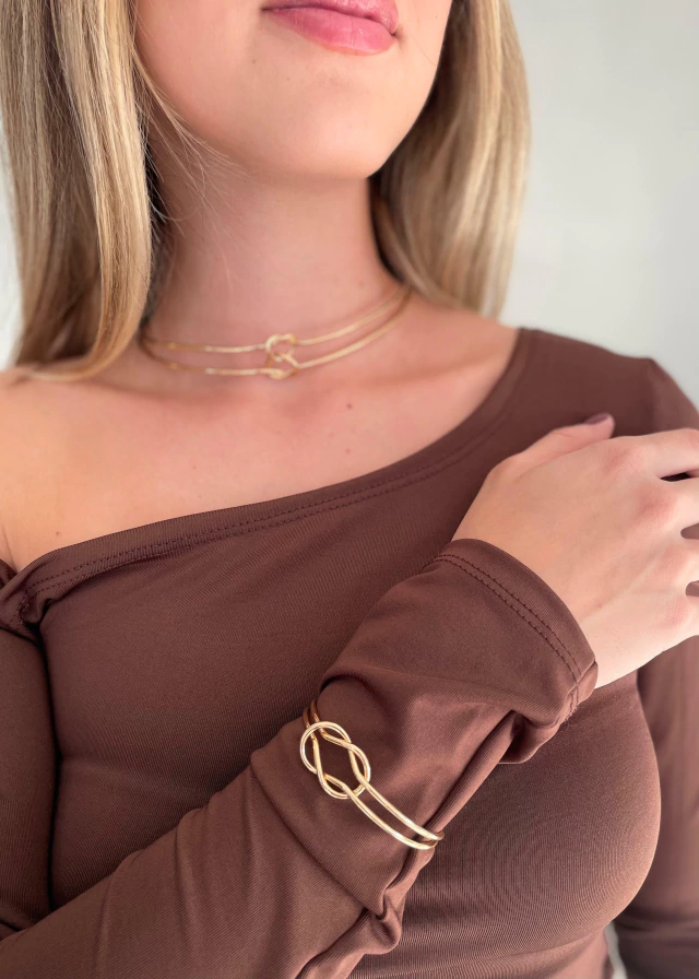 O Conjunto Nó Dourado simboliza elegância e conexão. Com design minimalista e traços leves, esse colar e pulseira são perfeitos para compor looks modernos com um toque de sentimento. Ideal para usar ou presentear